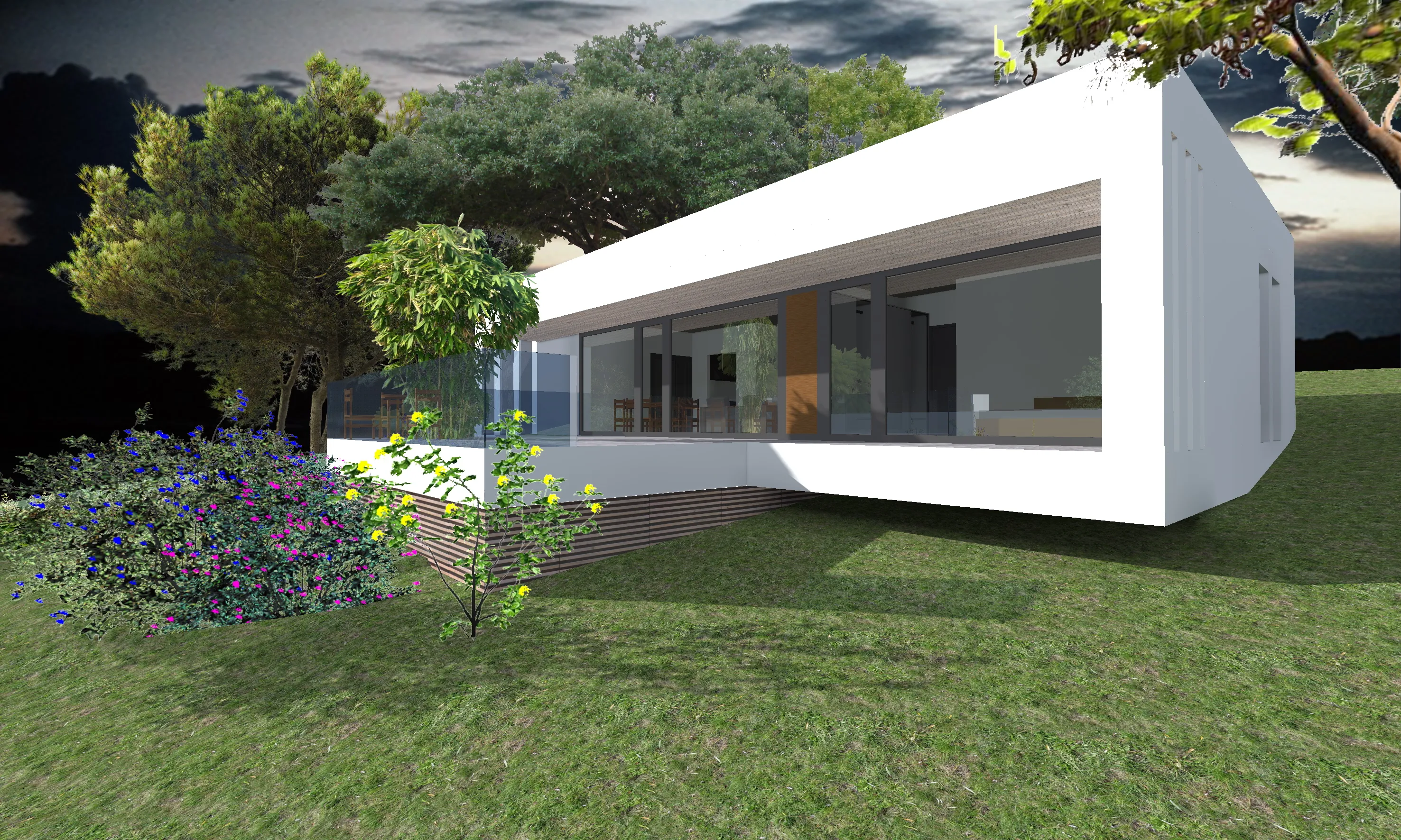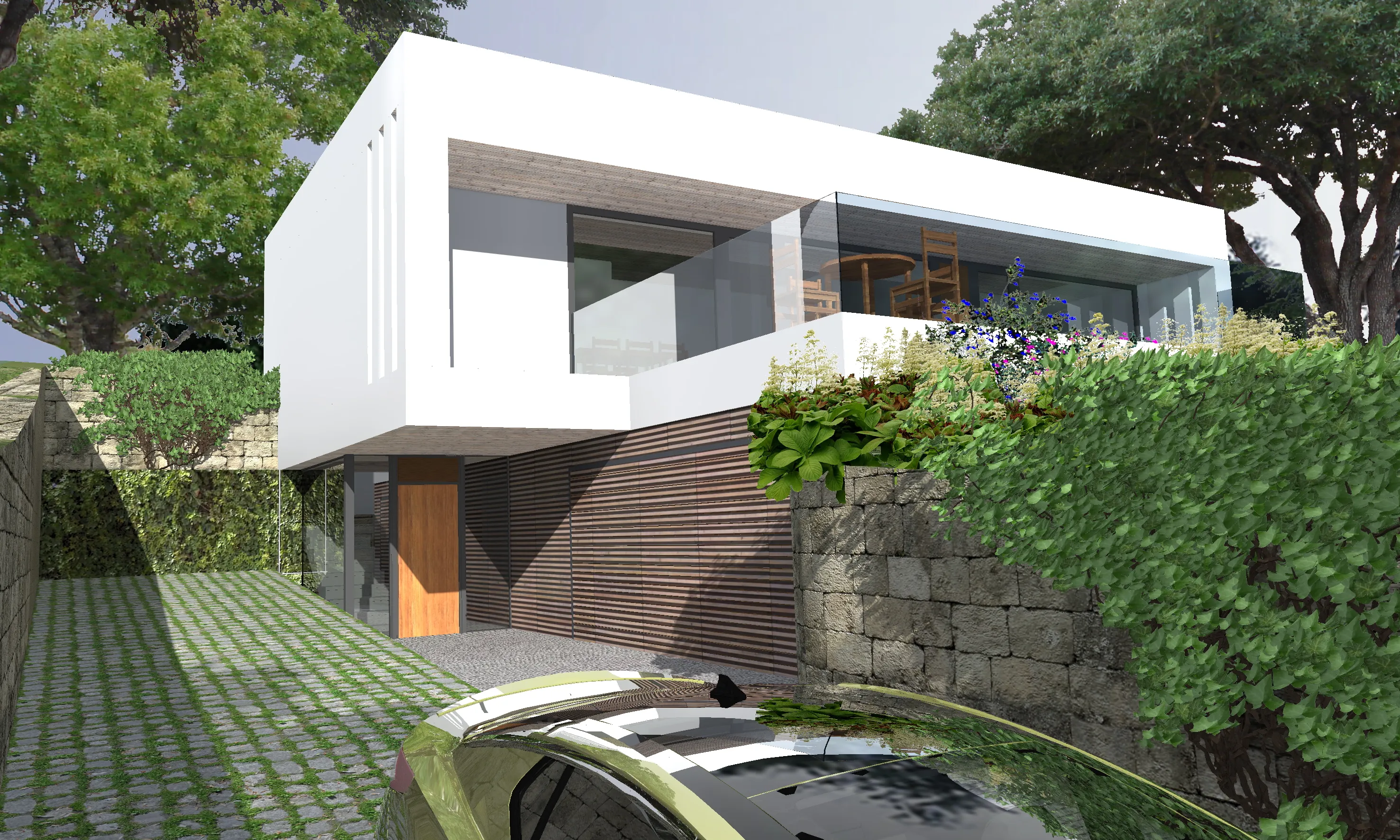 Az Óbudán, lejtős terepen megvalósult kétlakásos beépítésnél a telepítés érzékenyen igazodik a domborzati viszonyokhoz, így a teraszok közvetlenül a terepre ülnek, az autótárolók pedig a felszín alá kerültek. A nappali és hálóterek elhelyezése lehetővé teszi a teljes panoráma élvezetét a Pilis hegyei felé, miközben a tereplejtésből adódó szintkülönbségek építészeti értékké válnak. Az épület így harmonikusan illeszkedik a környezetbe, miközben magas komfortszintet biztosít a lakók számára.